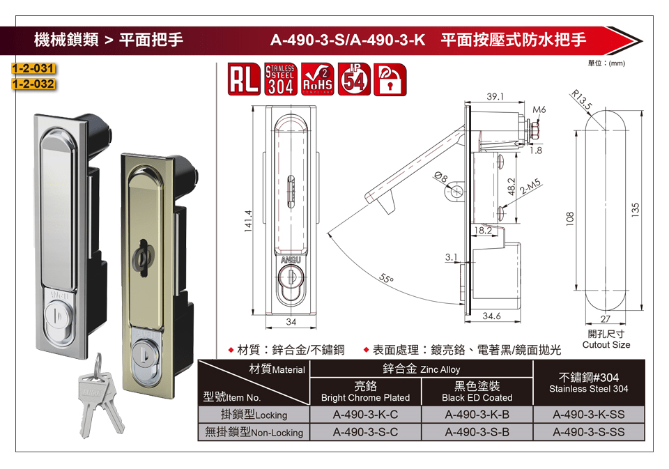 / A-490-3-K 平面可掛鎖按壓式防水把手