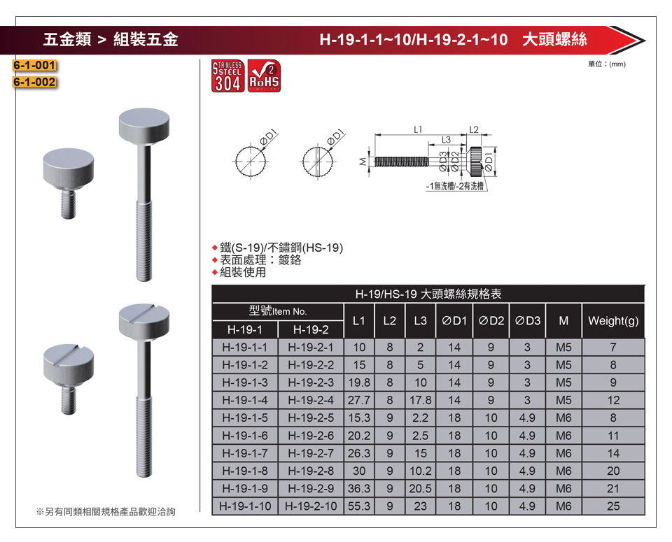 / H-19-1-1~10 大頭螺絲